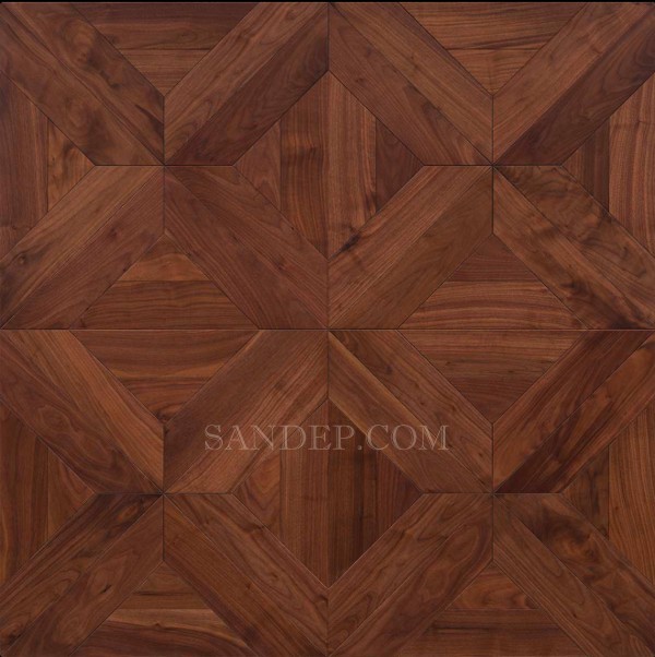 Mẫu sàn gỗ hoa văn ANELLO AT-V601 được thiết kế dựa trên cấu trúc hình học đối xứng chuẩn mực, mô phỏng các mẫu sàn khảm gỗ trong lâu đài châu Âu thế kỷ XVII. Trung tâm của mỗi viên ván sàn là một mô-đun hoa 8 cánh đối xứng, được ghép lại từ các hình tam giác và hình thoi, tạo thành hiệu ứng thị giác ba chiều (3D). Các chi tiết ghép vân được xử lý tinh xảo để khi ghép nối, toàn bộ bề mặt sàn tạo thành một mạng hoa văn liền mạch, mang lại cảm giác chuyển động ánh sáng tinh tế theo từng bước chân, từng góc nhìn.