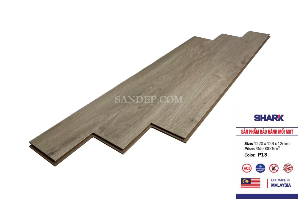 Sàn gỗ Shark P13 được sản xuất từ HDF cao cấp, có khả năng chống ẩm và chịu nhiệt tốt, giúp sàn giữ được vẻ đẹp theo thời gian mà không bị phồng rộp hay cong vênh. Với lớp phủ bề mặt chống nước và chống mối mọt, sản phẩm này đặc biệt phù hợp với khí hậu ẩm ướt của Việt Nam.