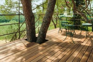 – Lát sàn ngoài trời: Một ứng dụng khác của sàn gỗ Teck biến tính (teak thermo wood) là lát sàn cho không gian ngoài trời, chẳng hạn như sàn sân vườn, sàn ban công hay sàn hồ bơi, sàn khu vui chơi trẻ em, sàn các du lịch – thắng cảnh ngoài trời. Sàn gỗ Teak có tính năng chống thấm nước và chống mục nát, chống chịu thay đổi thời tiết và tia UV.