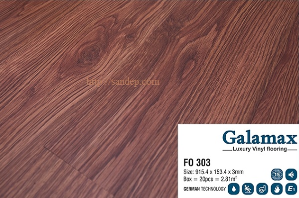 Sàn nhựa Galamax FO303 giả gỗ là loại ván sàn dán keo có thành phần chính là nhựa PVC nguyên sinh an toàn với sức khỏe. Sản phẩm có khả năng chịu nước, chịu nhiệt, chống tĩnh điện, bền màu.