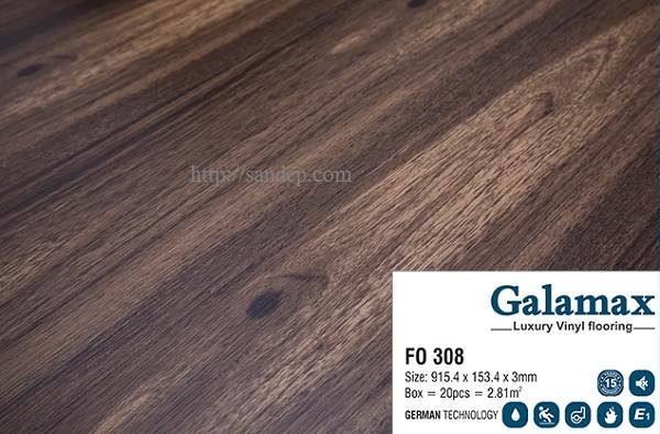 Sàn nhựa dán keo Galamax FO308 giả gỗ có thành phần chính là nhựa PVC nguyên sinh an toàn với sức khỏe. Sản phẩm có khả năng chịu nước, chịu nhiệt, chống tĩnh điện, bền màu.